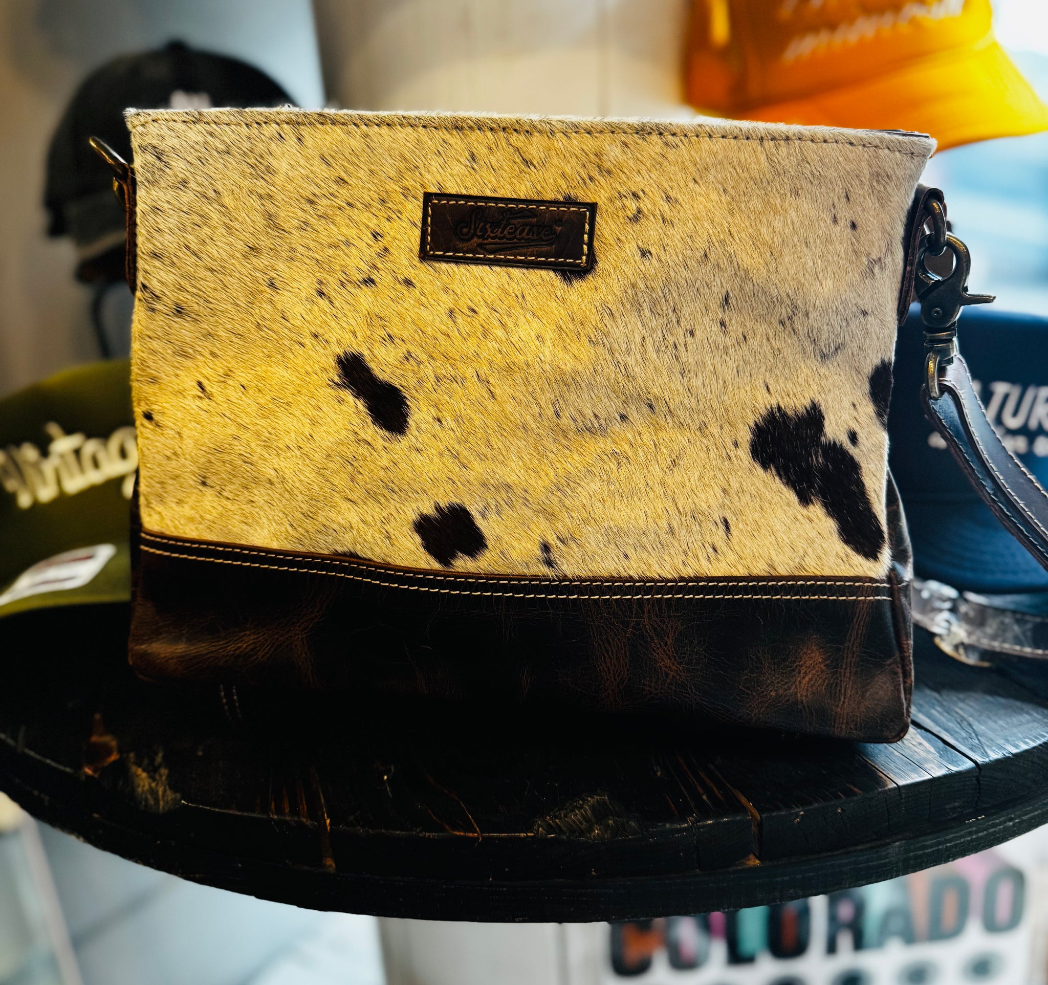 Material :Leather and Hairon Leather Utility (Outside) : 1 Zip pocket at back. Utility (Inside) : Main compartment with 1 zip pocket & 2 slip pockets. Lining: Poly Cotton Step Logo Printed Collection : The Jersey Collection Fittings : Antique Finish Metal Fittings Dimensions ( In Inches ) : 9 H x 12 W x 4 D Handle : N/A Shoulder : 52" Adj. Strap Closure : YKK Brass Zipper
