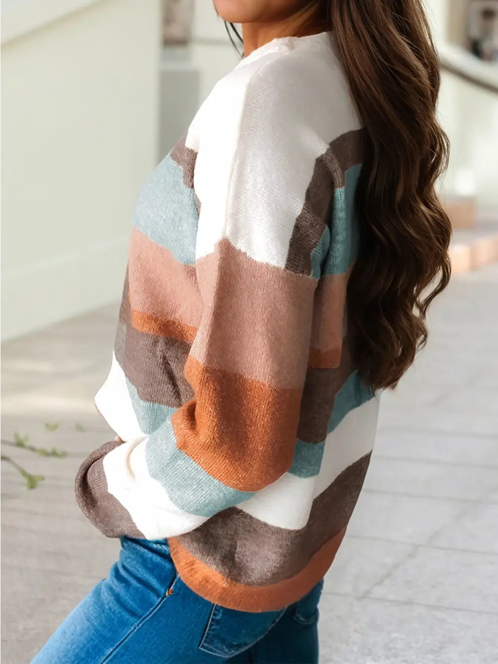 Bold geometry meets cozy comfort. This knit sweater combines dynamic stripes, modern color-blocking, and a relaxed drop shoulder design for a statement-making layered look.