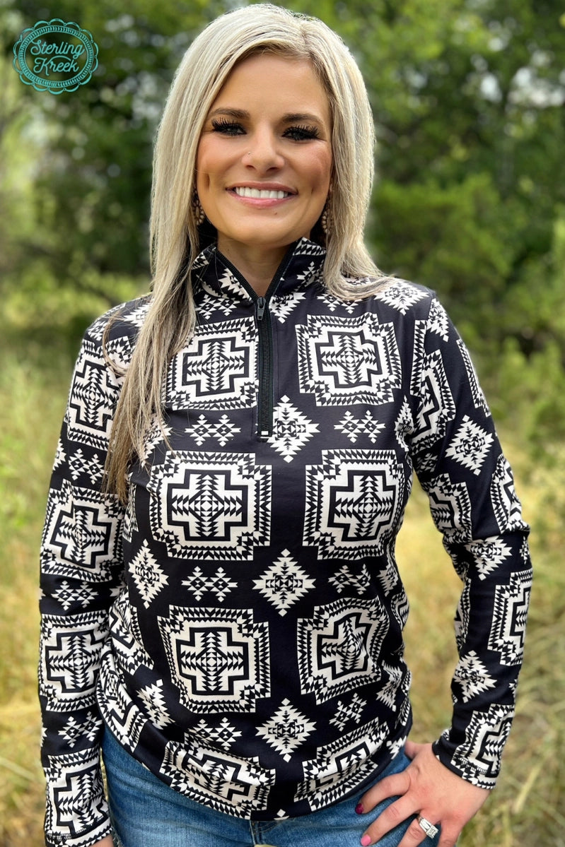 Introducing our Down In The Hills pullover, featuring a bold cream aztec design on a sleek black backdrop. Perfect for chilly adventures or cozy days at home, this pullover adds a touch of style and comfort to any outfit.