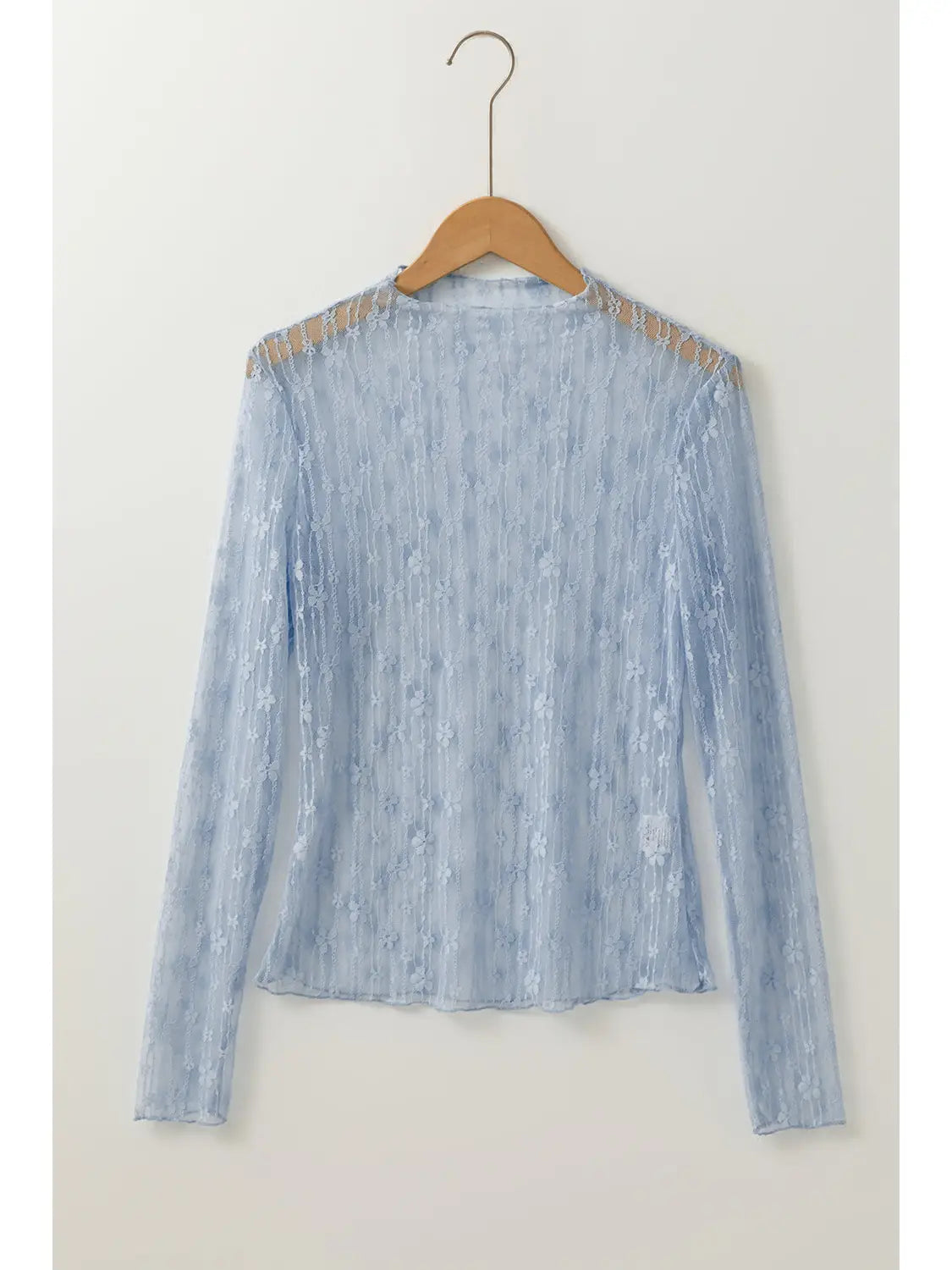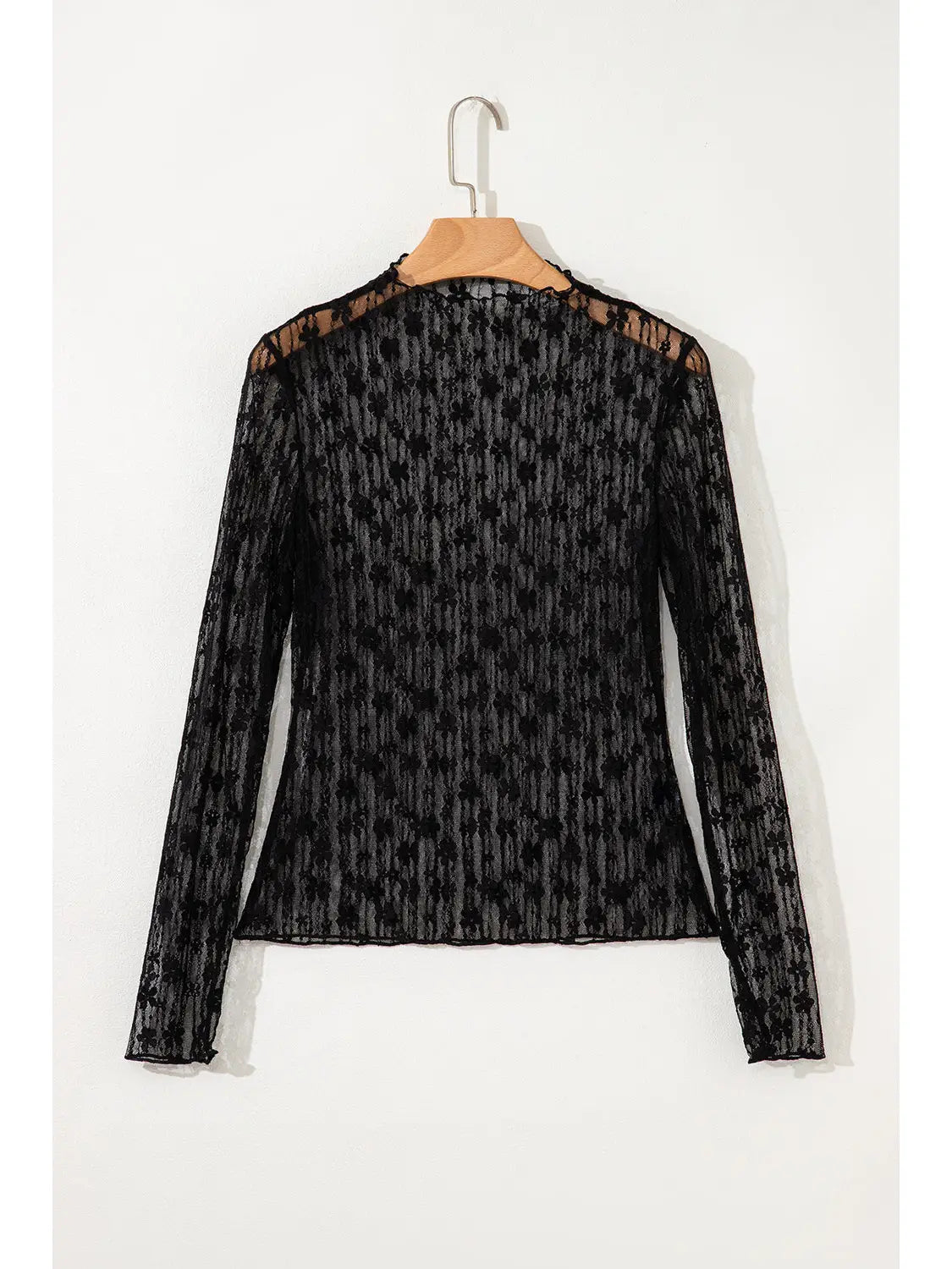 Made with precious lace fabric, this top features a classic mock neckline, fitted long sleeves, and lettuce hem detailing throughout. Its delicate and sheer floral design adds a touch of grace and allure. Perfect for layering or wearing on its own with a bralette, this top is a must-have for any wardrobe. Polyester/Spandex